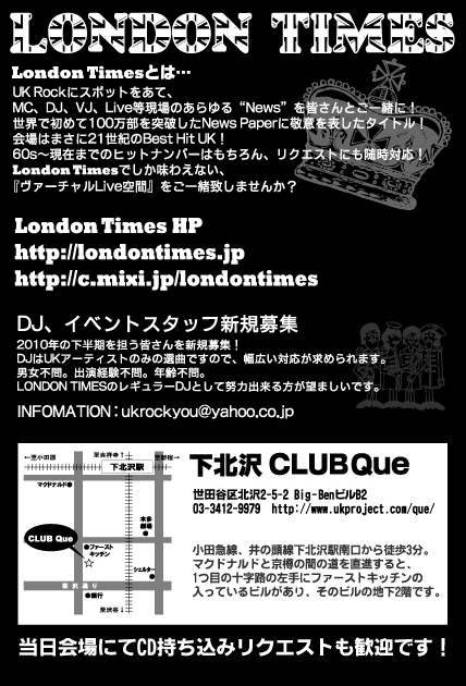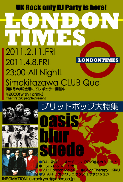 2011年もよろしくお願い致します。 今年最初の開催は僕の10代の頃に流行し影響を受けました、 suede、blur、oasis etcをピックアップし、ブリットポップ特集での開催を実現致しますよ! 90s+αなロンドン&マンチェスターセレクトに酔いしれる夜をご一緒出来れば幸いですよ。 “London Times No.71” 日時:2/11(金)23:00〜All Night! 会場:下北沢CLUB Que 03-3412-9979 住所:世田谷区北沢2-5-2 Big-BenビルB2 http://www.ukproject.com/que/ ※下北沢駅南口から徒歩3分。 マクドナルドと京樽の間の道を直進。 一つ目の