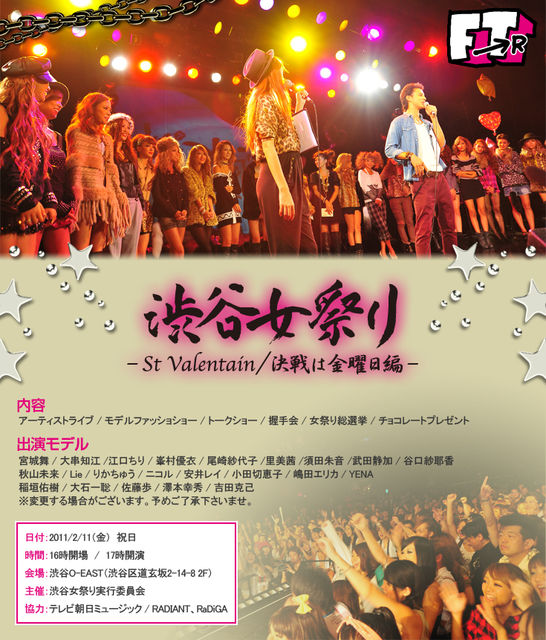 日程 : 2011/02/11(金) 会場 : 渋谷ON AIR EAST 時間 : 開場16:00 開演17:00 料金 : 前売り3000円 当日3500円 出演者 : C&K、ハジ→、and more モデル: 宮城舞(JELLY).大串知江(JELLY)/江口ちり(JELLY)/Lie(EDGE STYLE)/須田朱音(nuts)/峯村優衣(nuts)/武田静加(nuts)/里見茜(nuts)/尾崎紗代子(nuts)/谷口紗耶香(nuts)/秋山未来(PopSister/EDGE STYLE)/小田切恵子(Fine)/平野いえな(WOOFIN’girl)/嶋田恵里香/安井レイ(Ranzuki)/りかちゅ