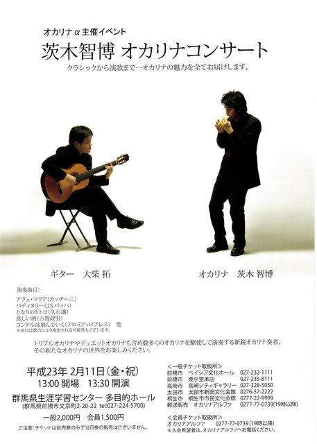 演歌からクラシックまで・・・ トリプルオカリナ、デュエットオカリナまで駆使し、オカリナの魅力のすべてを皆様に・・ 1.日 時:平成23年2月11日(金・祝)13時開場、13時半開演 2.会 場:群馬県生涯学習センター多目的ホール(前橋市文京町2-20-22) 3.出演者:茨木智博(オカリナ)、大柴拓(ギター) 4.チケット:一般2,000円、オカリナアルファ会員 1,500円 5.主 催:オカリナアルファ チケット取扱所はホームページ↓か、チラシをご覧ください http://www2.wind.ne.jp/ocarina/alpha/proc