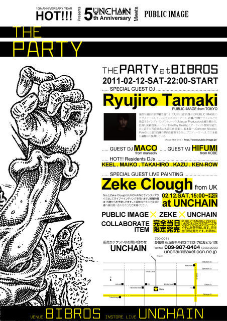 10th ANNIVERSARY YEAR HOT presents UNCHAIN 5th ANNIVERSARY meets PUBLIC IMAGE 『The PARTY』 2011-02-12-SAT-22:00_START @club BIBROS SPECIAL GUEST DJ/ Ryujiro Tamaki (PUBLIC IMAGE) GUEST DJ/ MACO (maniacliv) GUEST VJ/ HIFUMI from KOBE ・・・・・HOT Residents DJs・・・・・ KEEL,MAIKO,TAKAHIRO,KAZU,KEN-ROW AD///2,000yen wz 2DRINK DR///2,500yen wz 2DRINK 学割///2,000yen wz 2DRINK(ID提示願います) TICKET 取扱