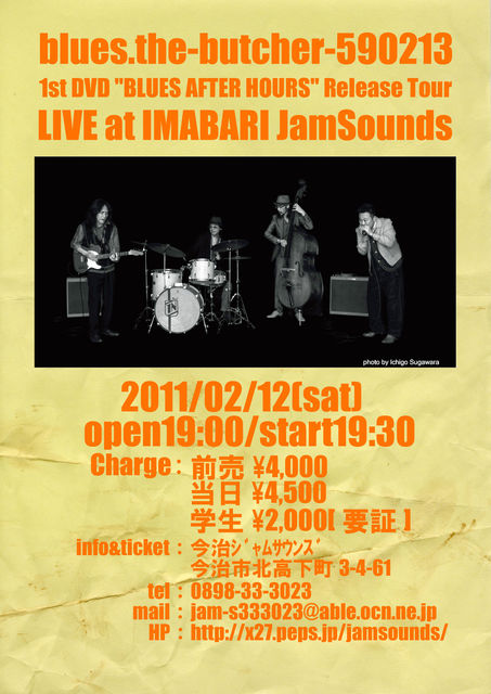 管理人様。貴重なスペースお借りします。 blues.the-butcher-590213 初のDVD"Blues After Hours"リリースツアー。 ブルーズ・ザ・ブッチャー待望の映像作品リリース!!! 日常のライヴで鍛え上げた強靭なバンドサウンドを真空パックしたDVDを携え、半年ぶりの今治公演決定! このDVDはライヴ会場限定販売です。 買い逃してしまうと入手出来なくなる可能性大。 激安デフレ価格の¥2000!!! この機会をお見逃し無く! ブルーズ・ザ・ブッチャーLIVE at 今治ジャムサウンズ 2011/2/12(土) オープン19:00/スタ