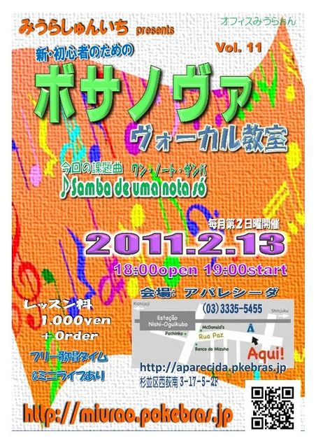 おなじみ「ボサノヴァに興味がある」「ちょっと歌ってみたい」と思っている方にぴったりの当イベント、第11回のお知らせです。今回の課題曲は♪Samba de uma nota só(ワン・ノート・サンバ)です。