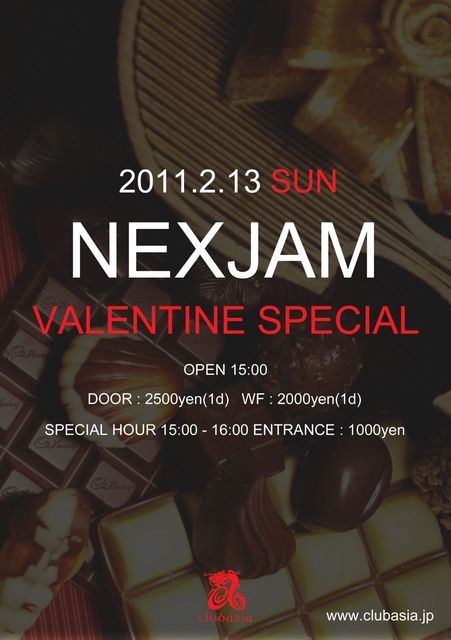 告知失礼致します。 2月13日(日) 渋谷クラブエイジアにてNEXJAMバレンタインパーティーを行います 気鋭のサンデーアフタヌーンパーティーNEXJAM。 2011年も勢いそのままに拡大を続ける。 渋谷 clubasiaにて、世界中のクラブで最先端のフロアサウンド、 そしてパーティー感満載の温かい雰囲気とともに、 総勢500名規模の本格的なビッグパーティーをお届けする。 都内の主要クラブで活躍する出演陣が、 clubasiaの3フロアを別々のコンセプトで展開する空間。 バレンタインスペシャルとしてお送りする2011年初回 ぜ