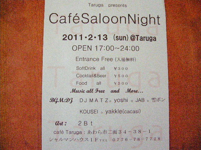 Taruga presents CaféSaloonNight 2011・2・13 (sun)@Taruga OPEN 17:00~24:00 Entrance Free (入場無料) SoftDrink all ¥300 Cocktail&Beer ¥500 Food all ¥500 Music all Free and More… BGM:DJ DJMATZ☆ yoshi ☆ JAB ☆ 雪ボン KOUSEI ☆ yakkle(cacasi) Art : 2Bt café Taruga:あわら市二面34−38−1 シャルマンハウス1FTEL 0776−78−7728 またやります!ゆる〜