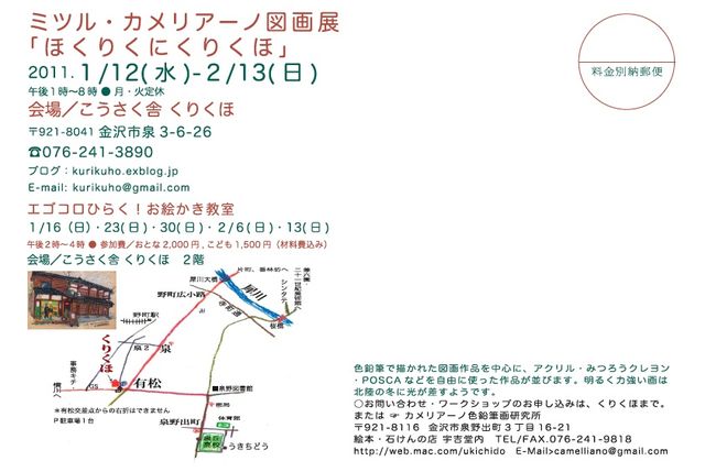 ミツル・カメリアーノ図画展を開催中です タイトルは☞「ほくりくにくりくほ」 1月12日(水)〜2月13日(日) 午後1時〜8時 月・火定休 ***期間中の毎週日曜日は、くりくほ2階でおえかきワークショップをやります。 予約していただけるとうれしいです。 ◎エゴコロひらく!お絵かき教室 1月16日(日) 23日(日)30日(日) 2月6日(日)13日(日) 午後2時〜4時 参加費/おとな2,000円,こども1,500円(材料費込み) **受講生募集中 会場/こうさく舎 くりくほ