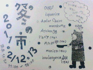 『クマの冬の市』 高畑町のカフェ南果でクマの冬の市が開催されます。 2/12(土)13(日) 11:00〜18:00 場所:カフェ南果 http://nankanara.exblog.jp/ カフェ南果さんを以前このコミュで紹介させて頂いた時のトピック http://mixi.jp/view_bbs.pl?id=20192962&comm_id=385409 奈良市高畑町1331ー2 TEL&FAX: 0742(24)7466 OPEN 11:00−18:00 火曜定休 臨時休業有り アクセス方法 市内循環・中循環『破石町』下車徒歩10分 地図:http://www.nanka.net/shopcafe.htm 参