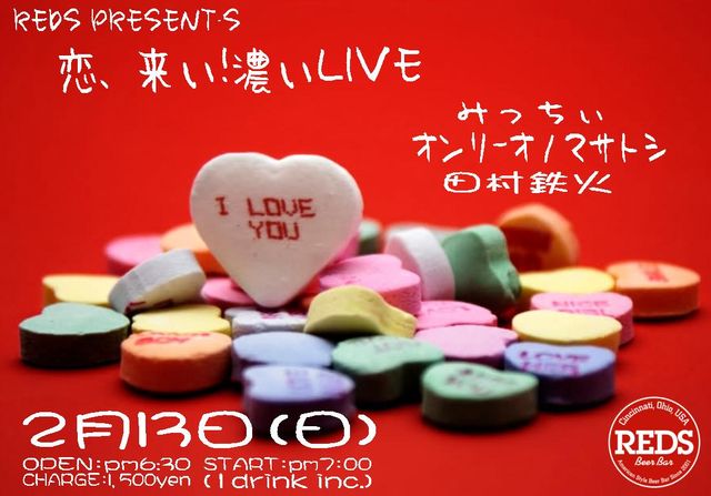 今年も、甘〜い季節がやって来ました.+:。(≧∇≦)ノ゚.+:。 やっぱ、バレンタインは ディープインパクトなアーティストと 濃厚な夜を過ごさなきゃね♪ てなわけで!!! REDS present's 『恋、来い、濃いLIVE』 2月13日(SUN) OPEN/pm6:30 START/pm7:00 DOOR/1,500yen(tax inc.)=1drink込み= ACT みっちぃ〜 オンリーオノマサトシ 田村鉄火 やっぱ出演は、この方々以外にないでしょ!!! ムード満点の空間で、 ロマンチックにチョコ交換も粋だねぇ♪ 今回、お食事は… 『チョコ&チーズフォンデュ』を用意します