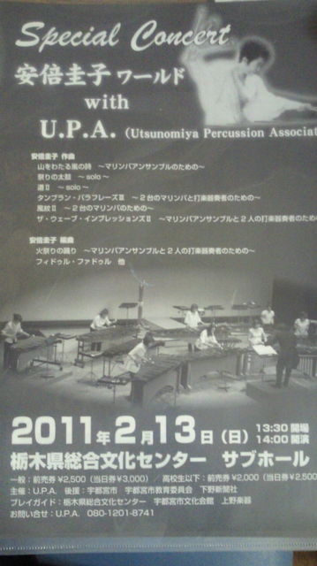 一般:前売券¥2500(当日券¥3000) 高校生以下:前売券¥2000(当日券¥2500) 全席自由です 曲は…安倍先生の作曲、編曲された曲です 山をわたり風〜マリンバアンサンブルのための〜 祭りの太鼓〜ソロ〜 道?〜ソロ〜 タンブランパラフレーズ?〜2台のマリンバアンサンブルと打楽器奏者のための〜 風紋?〜2台のマリンバのための〜 ザ・ウェーブ・インプレッションズ?〜マリンバアンサンブルと2人の打楽器奏者のための〜 火祭りの踊り〜マリンバアンサンブル