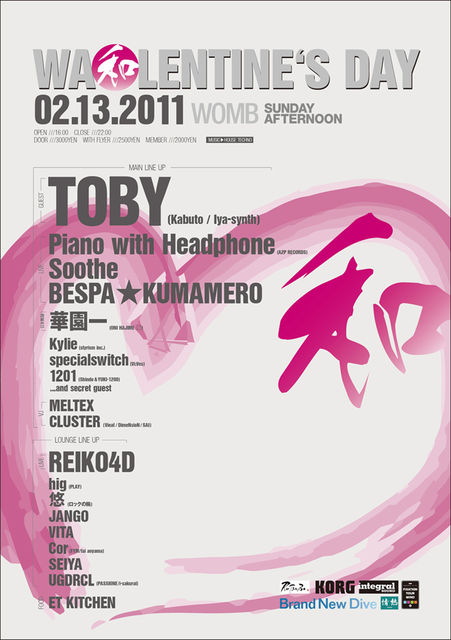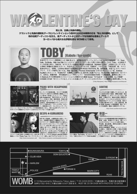 2011年一発目のライブは、なんと渋谷WOMB!! またTobyさんも一緒ですよー! 2/13(sun) 【WA LENTINE'S DAY@渋谷WOMB】 OPEN : 16:00 - 22:00 DOOR : \3,000 W/F \2,500 MEMBER \2,000 SPECIAL GUEST : TOBY(Kabuto / lya-synth) LIVE: Piano with Headphone(A2P RECORDS), soothe, BESPA★KUMAMERO 日本舞踊(TRADITIONAL JAPANESE DANCE): 華園一(ONI HAJIME □) LINE UP: Kylie(Styrism inc.), specialswitch(Vi:Ves), 1201(Shindo&YUKI-1200), AND SECRET GUEST!!!!! VJS : MELTEX , CLUSTER(Vieat/DimeNsioN/SAI) VIP L