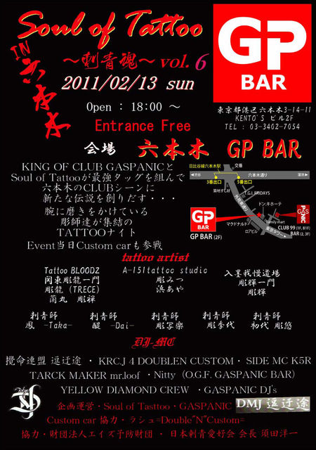 お久しぶりです、最近更新して居ませんでしたが告知です 2011年明けましておめでとうございます去年も色々なEventがあり来て頂いた方ありがとうございます 2011年のGP BAR一番乗りでお初の一発目のEventを紹介します。 Soul of Tattoo IN 六本木 GP BAR