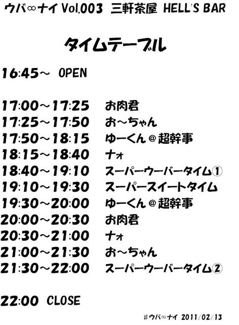 ウバ∞ナイ Vol.003 ●2011年 2月 13日 (日) ●OPEN 16:45 SRART 17:00 CLOSE 22:00 ●料金 前日までに参加表明された方 1500円(1ドリンク付) 当日参加希望の方 1800円(1ドリンク付) ●場所 三軒茶屋HELL's BAR http://go-to-hell.jp/HELL%27S/access.html 東急田園都市線 三軒茶屋駅 北口B出口の階段を上り、 そのまま進行方向に国道246号線沿いを渋谷方面に徒歩3分。 1階にコンビニエンスストア(みんなのイチバ)が入ったビルの2階です。 2階専用のらせ