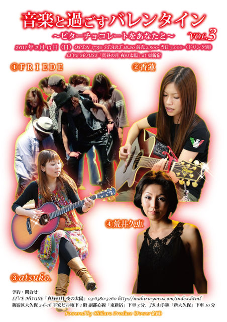 2011.2.13(Sun) AT:真昼の月夜の太陽 http://mahiru-yoru.com/ open17:50 start18:20 前売/2500 当日/3000(ドリンク別) ★20:00〜の出演予定です。 バレンタイン前夜に、皆さんにパワーをお届けします笑。 ビターチョコレートと楽しい音楽をプレゼントフォ〜ユ〜