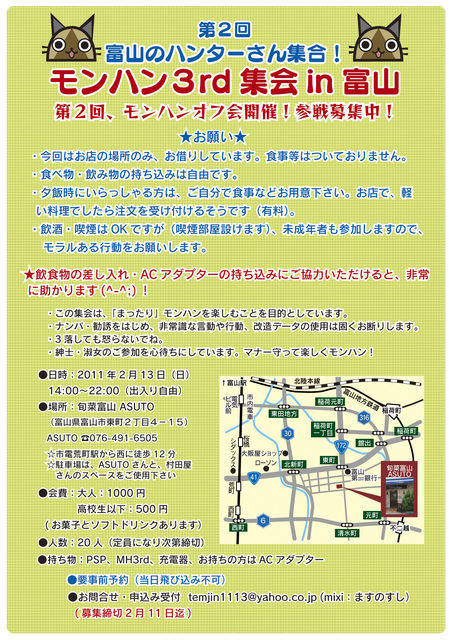 【追記:11.02.02】 食事のことについて問合せがありましたので、回答します。 今回はお店の場所のみを、お借りしています。食事等はついていません。 しかし、お店の人に当日注文してもらえば、パスタやピザなど簡単なものは、作ってくれるそうです(別料金)。 また、当日食べ物・飲み物は持ち込みOKです。 夕食どきにいらっしゃる方は、ご自身で食事などをご用意下さい。 当日、飲食物の差し入れ・ACアダプターの持ち込みにご協力いただけると、非常に助かります(^-^;)! *********************