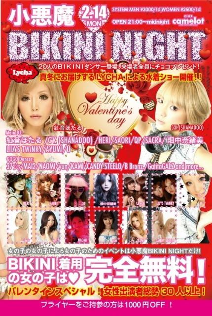 渋谷キャメロットで開催の人気イベント小悪魔ビキニNIGHT http://mixi.jp/view_community.pl?id=4934753 2月14日月曜日今回はバレンタインスペシャル 真冬にお届けするLYCHAによる水着ショー開催 さらには来場者全員にチョコプレゼント 女性出演者30人 毎回500人を超え大盛り上がり 基本毎月第2月曜日開催 ビキニ着用の女の子は入場無料 ミニスカ着用の女の子も入場無料 ※入場時に自己申告してください。 セクシータレン