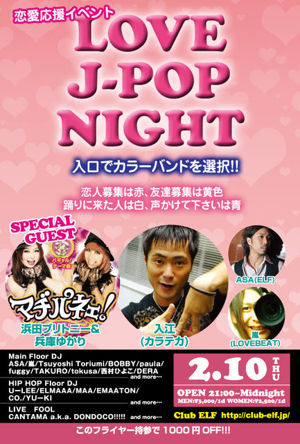 2月10日渋谷ELF(エルフ)にて LOVE J-POP NIGHT が大盛況につき2度目の開催 毎回1000人越えのラブビートの姉妹イベントです 入り口で4種類のカラーバンドを選択 してもらっての入場 詳しくはこちらでチェック http://ameblo.jp/lovebeat-kitene/ ゲストには 超話題イベントのJ-POP NIGHTからカラテカ入江 ユニットで歌手デビューしたギャル漫画家の浜田ブリトニーが登場です 元あいのりメンバーも登場 さらにサプライズゲストも‥ モ