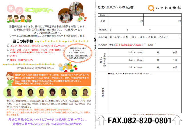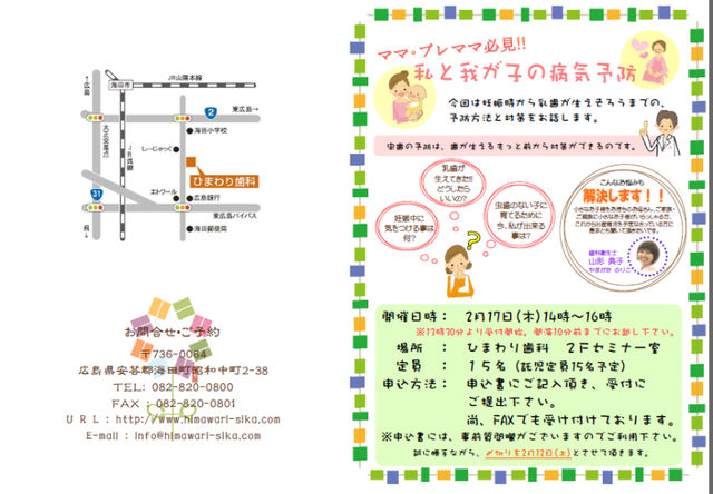 子供さんが元気で健康に育ってほしい。 そんなお母さん方、これからお子様をもちたいと考えている方、 子供さんの健康づくりは実は妊娠前から始まっているのです。 今回は「虫歯予防」にスポットを当て、プロの立場から 虫歯のメカニズム、歯科医院で行う検診、ご家庭でできる虫歯予防について お話させていただきたいと思います。 保育士による託児も用意しておりますので、お気軽にご参加ください。 詳しくは http://ameblo.jp/himawari-sika/entry-10788943346.html をご覧ください。