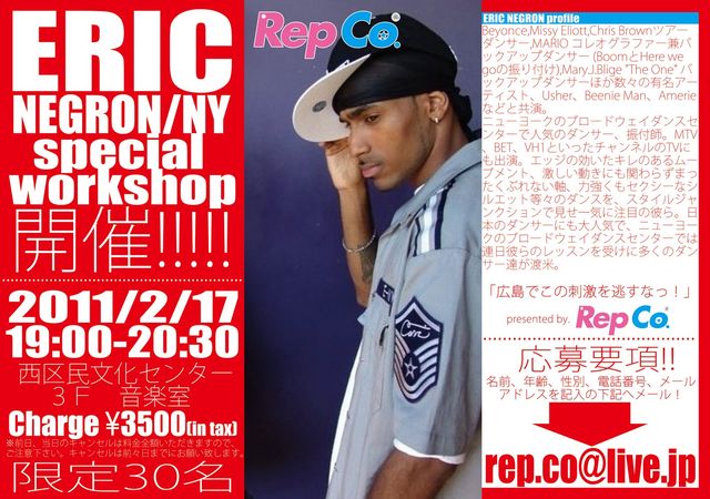ERIC NEGRON from NewYork Special Workshop 2011年2月17日(木曜) 19:00-20:30 西区民文化センター 3F 音楽室 料金 \3500(in tax)※要予約 ・申込要項 名前、年齢、性別、電話番号、メールアドレスを 記入して、 rep.co@live.jp へメールを送信して下さい。 ※前日、当日のキャンセルは料金全額いただきますので、 ご注意下さい。キャンセルは前々日までにお願い致します。