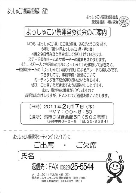 ご無沙汰しております! 樽村実行委員長から配信がありました! 遅くなりましたがアップしますので、参加出来る方は ぜひいますぐ参加の旨、下記FAXかメールをお願いします! 期限過ぎてててもOKです! あわせてわしまで一言連絡もらえると助かります。 よろしくお願いします! いつもお世話になります。 よっしゃこい祭運営委員会のご案内(2月)を お送りさせて頂きました。(PDF) ご確認の程よろしくお願いいたします。 お手数おかけしますが,ご返信は、 FAX25−5544又は、メールinfo@yosya.jpまで お願い致します。