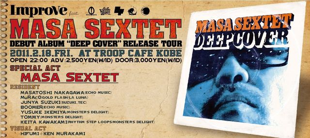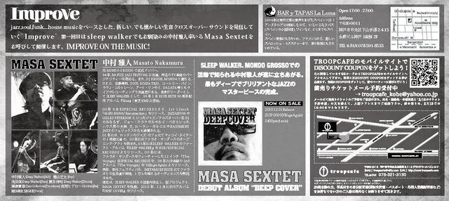 SLEEP WALKERの中村雅人が率いるニュー・プロジェクト、 "MASA SEXTET" が遂に本格始動!! 時代に流されないワールド・クラスの スピリチュアル・ジャズを生で体験しよう!! 沖野修也さんのBlogをチェック http://ameblo.jp/shuya-okino/entry-10738427068.html DISCOUNT COUPONをゲットしよう! http://troopcafe.iflyer.jp/venue/flyer/76282 Improve 2011.2.18.FRIDAY/22:00- @TROOPCAFE,KOBE http://troopcafe.iflyer.jp/venue/ ADV:2,500yen(1d)/DOOR:3,000yen(1d