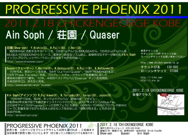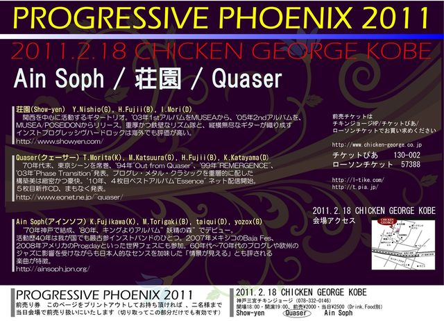 告知よろしくお願いします 【Progressive Phoenix 2011】荘園/Quaser/Ain Soph 2011/2/18(金) 神戸三宮チキンジョージ 078-332-0146 開場18:00・開演19:00、前売\2000・当日\2500(Drink,Food別) http://www.chicken-george.co.jp フライヤー下記 http://www.eonet.ne.jp/~quaser/phoen218.jpg ------------------------------------------------------------------- Quaser(クェーサー) T.Morita(K), M.Katsuura(G), H.Fujii(B), K.Katayama(D) 70年代末、東京シーンを席巻、'94年"Out from Quaser"、'99年"REMERGENCE"