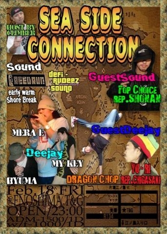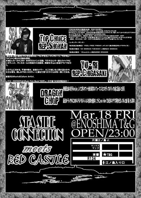 【Sea Side Connection】 2/18(Fri) @T&G 会場地図 http://www.chizumaru.com/maplink.asp?SER=all&D=all&X=502158.377&Y=127095.726&SCL= 23:00〜5:00 ADM \1500/1D W/F \1000/1D ■Guest Sound Top Choice rep 湘南 ■Guest Artist YU-RI rep 茅ヶ崎 DRAGON CHOP rep 相模原 ■Sound REED RUN Defi-Rudeez ■RUB-A-DUB 未来 MYKEY HYUMA &Rub A Dub ■Early Warm SHORE BREAK ■Host By CLIMBER Next Sea Side Connection….3/18 Meets RED CASTLE
