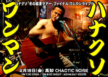 ただいま絶賛日本中に熱きシャウト轟かせまくる、当店随一の青春ど真ん中野郎"ハナクソ"君!! 感動のツヤーファイナルが今週末金曜日に迫って参りました〜〜〜!! アヒィィーー(T_T) この地下室に集う皆っさん!! "ハナクソ"渾身のワンマンライブ(約5時間予定!!)を見逃さないで!! そろそろいいだろ?? もういいだろ?? 全てを捧げて駆け抜けようぜっ!! ● 02月18日(金)[ ハナクソ「冬の稲妻ツアー」ファイナル ワンマンライブ ] PM 7:30 OPEN / PM 8:00 NOISE : ADV&DAY 1000円 Feat : 冬の稲妻"ハナクソ"!!!!!!!!