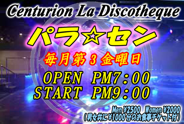 毎月第3金曜日開催中 センチュリオン通常営業 ◆パラ☆セン◆ 時間 19:00〜21:00 (BARのみでの営業) OPEN 21:00 CLOSE 27:00 ※2010年9月より※ 19:00〜21:00 上記の2時間をBAR営業として 開始しますので皆さん是非お友達 を誘って遊びに来て下さい フ−ド等も沢山ご用意してます メインフロアは今まで通りの営業 21:00からのスタートです BAR営業の時にお支払い頂いた 入場料でそのままパラ☆センへの 入場も可