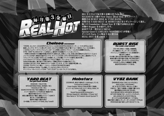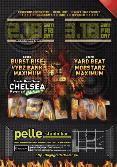 告知失礼致します。 2011年2月より毎月第3金曜にJR大宮駅東口徒歩すぐにある大宮PelleにてMAXIMUM主催のNew Dance 【Real Hot】がスタートします! 偶数月は東京からBURST RISE & 埼玉からはVYBZ BANK, そして奇数月は横浜からYARD BEAT & MOBSTARZがレギュラーとして、極上のFoundation〜Brand Newまで他では味わえない本物のReggaeをお届けします。 記念すべき一発目は特別出演でCHELSEA MOVEMENTが登場! 2/18(金) 【REAL HOT】 -Openning Special- @大宮Pelle 埼玉県さいたま市大宮区宮町2-8-2 第9MATSUビル4F(大宮駅徒歩3