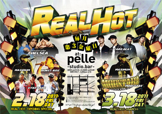 2/18(金) 【REAL HOT】 -Openning Special- @大宮Pelle 埼玉県さいたま市大宮区宮町2-8-2 第9MATSUビル4F(大宮駅徒歩3~5分) TEL:048-793-4950 毎月第3金曜開催 ■Special Guest Sound≫ CHELSEA MOVEMENT http://mixi.jp/view_community.pl?id=3409958 ■Sound≫ BURST RISE http://mixi.jp/view_community.pl?id=338728 VYBZ BANK http://mixi.jp/view_community.pl?id=2883465 MAXIMUM http://mixi.jp/view_community.pl?id=53960 2011年2月より毎月第3金曜大宮PelleにてMAXIMUM主催の