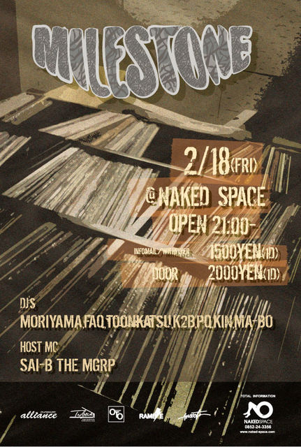 ヒップホップ〜ブラックミュージックを軸としたクラブ遊びをさらに盛り上げるべく発足したイベントMILESTONE!!今回も松江、出雲、米子、倉吉の若手中心に独自のグルーヴを醸し出すドス黒いメンツでお送りいたします。2011年より多方面に声をかけ、ディープディガー達が偶数月第