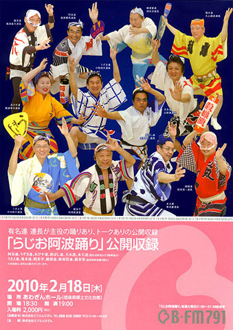 「らじお阿波踊り」新番組記念 テーマは 連長 有名連約600人と 「連長」の踊りあり トークありの公開収録 日時 2010年 2月 18日 開場 18:30〜 開演 19:00〜 場所 あわぎんホール 出演 徳島県阿波踊り協会 うきよ連 菊水連 藝茶楽 娯茶平 殿様連 蜂須賀連 阿波踊り振興協会