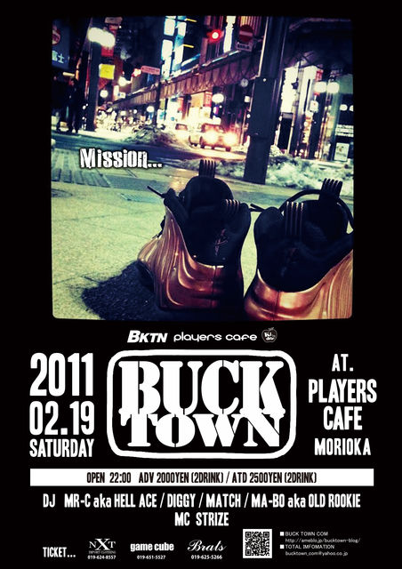 −準々決勝− 12:00頃 KICK OFF 前日は -2011FIRST MISSION!!- 2011/02/19(SAT) @PLAYERS CAFE mission... BUCK TOWN OPEN22:00>> ADV/2000(2D) ATD/2500(2D) DJ MR-C aka HELL ACE DIGGY Match MA-BO aka OLD ROOKIE MC STRIZE 2011のBUCK TOWNは2/19からミッションスタート!! 昨年同様PLAYERS CAFEはBUCK TOWN仕様に!! 「来てみないとわからない」 BUCK TOWN ORIGINAL STYLEをお楽しみ下さい!! TEAM BKTN PLAYER陣も昨年以上にPOWER UP! 2nd yearも飛ばして