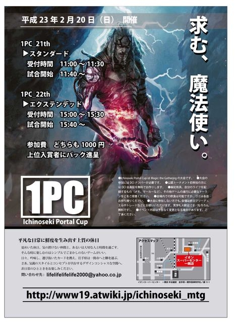 ◆はじめに スタンダードの公式大会です。 進行はDCIフロアルールに準拠しますが、現役を退いていた方やカードゲームに興味のある方が気軽にプレイできる環境の構築に努めます。 同日は15時30分からもスタンダードの大会を開きます。こちらも参加していただければ幸いです。 ◆開催日時 2011年02月20日(日) 11:00〜11:30 受付 11:40〜 試合開始 ◆会場 イオンスーパーセンター 一関店 中 会議室 住所:岩手県一関市狐禅寺字石ノ瀬11番1 ◆大会内容 レギュレーション:スタンダード 対戦数: 参加者数