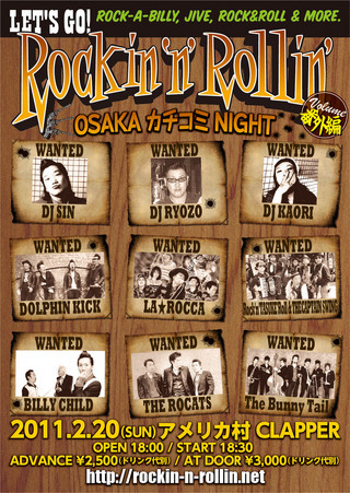 『LET'S GO!Rockin'n'Rollin'』 番外編 〜OSAKA カチコミ NIGHT〜 2011.2.20(SAN) @アメリカ村 CLAPPER 大阪市中央区西心斎橋2-10-34 心斎橋ウエスト363ビル B1F TEL : 06-6213-6331 OPEN 18:00 / START 18:30 ADVANCE 2,500yen / ATDOOR 3,000yen(ドリンク代別) ◆BAND◆ DOLPHIN KICK LA★ROCCA Rock'n'TASUKE'Roll & THECAPTAIN $WING BILLY CHILD THE ROCATS The Bunny Tail ◆Rockin DJ◆ RYOZO SiN KAORI *チケット問い合わせ アメリカ村 CLAPPER TEL : 06-6213-6331