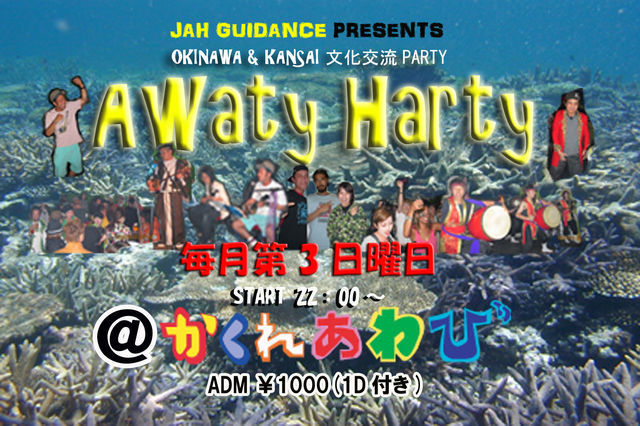 告知失礼します。 毎月第三日曜日アメリカ村@かくれあわび JAH GUIDANCE Presents 沖縄&関西、文化交流Party『Awaty Harty』@かくれあわび 音楽を通して沖縄と関西の文化交流を根本におき、 沖縄の伝統芸能、(三線、エイサー、沖縄音楽、空手など)をこっちの人にも 知ってもらい気軽に触れ合え広めていく そして同じく関西の文化やREGGAE、HIP HOP、HOUSE MUSICや関西の喋りの上手さ、DJスタイルなども 知ってらえるイベントです そして関西に出てきて頑張ってる沖縄県民の情報交換の場やこれから沖縄に旅行に行きたい、