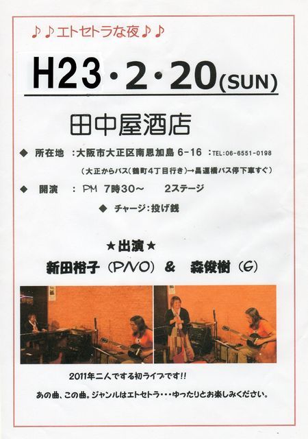 出演 ★新田裕子(p/vo)&森俊樹(g) 2ステージ =投げ銭= 19時半〜 2011/1/18 画像足しました ごめんなちゃい^^;