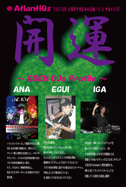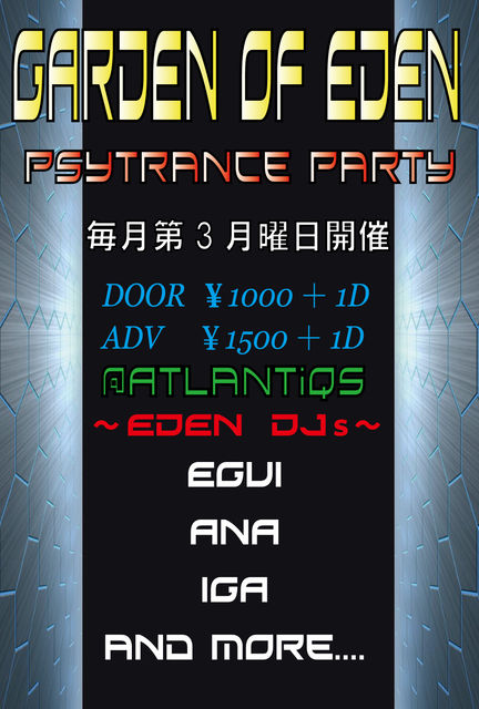 管理人様、告知失礼いたします。 2011.02.21 (Mon.) 【GARDEN OF EDEN】 Presents dance Party 『開運』 〜ふきのとうの巻〜 @ AtlantiQs OPEN 24:00〜06:00 DOOR \1500 (1d.) ADV. \1000 (1d.) ■ DJs ■ Naname45℃ (EDEN) とりあえずあげぽよ〜!な彼の酔いっぷりにひたすら爆笑!そんな彼のテクノチックな世界にご注目! IGA (EDEN) イスラエルからの新星!?中東アジアな顔立ち!どんとこいJapan!クールな彼のsoundは実はLet's!ポジティブ! EGUI (EDEN/E-pin creats) この方のDJ MIXは間違いな