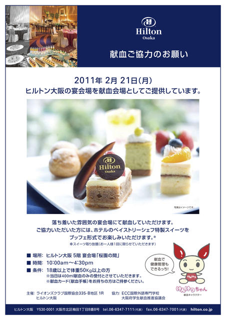 ヒルトン大阪の5階の宴会場で献血をしていただくことができます。 そして献血をしていただいた方にはヒルトンホテルのケーキを食べていただくことができます!! 一回だけですが、ビュッフェ方式でケーキとり放題です 日時:2月21日(月) 10時〜16時30分 場所:ヒルトン大阪 五階宴会場 内容:大阪市北区を中心に活動されている25団体のライオンズクラブ主催で行います。献血にご協力頂けた方には、ホテルで提供されているケーキを御用意させて頂いております。 よろしければご協力お願いします