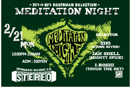 告知させていただきます。 ■MEDITATION NIGHT■ -70's to 80's ROOTSMAN SELECTION- 2011/2/21(mon) @Club STEREO 10:00PM - 2:00AM Adm:500yen -SELECTOR- ・SHO (STONE RIVER/PUT DOWN ROOTS) http://mixi.jp/view_community.pl?id=5396169 http://mixi.jp/view_community.pl?id=4418569 ・JAH SHELL (MIGHTY SPICE) ・I-ROSHI (TOUCH THE SKY) http://mixi.jp/view_community.pl?id=269097 - STEREO Address- 〒556-0011 (難波ロケッツ南側、旧SAOMAI) 大阪市浪速区難波中2-11-1 なんばピア6026 tel:06-663