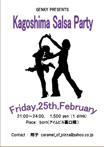 鹿児島サルサ、しょこです 2月の鹿児島サルサパーティーの開催日が決まりましたのでご連絡いたします 開催日 → 2月25日(金) 今回は金曜日になります 時間 → 21時〜24時 場所 → Born(鹿児島市東千石町1−15) 前回と同じ赤い扉のお店です! 金額 → 1500円 1ドリンク 音楽を聴いたり、お話したり もちろん踊ったり GENKY先生のセレクトソングでサルサを楽しみませんか(●^o^●) 1月に参加していただいた方はもちろん、今回時