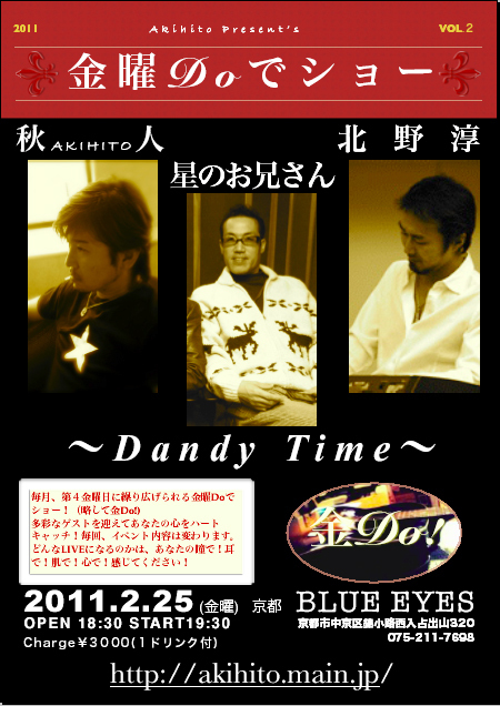 ★2月25日(金) 金曜Doでショー vol.2 open18:30 start19:30 charge¥3000(1drink付) 出演:秋人 / 星のお兄さん / 北野淳 毎月、第4金曜日に繰り広げられる金曜Doでショー!(略して金Do!)多彩なゲストを迎えてあなたの心をハートキャッチ!毎回、イベント内容は変わります。どんなLIVEになるのかは、あなたの瞳で!耳で!肌で!心で!感じてください! ♪秋人 http://www.akihitomusic.com/ ♪星のお兄さん http://hoshiani.com/ ♪北野淳 http://kitanojun.syncl.jp/