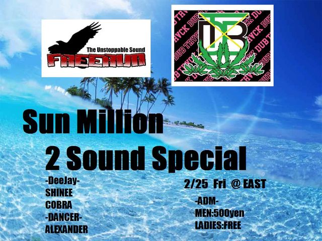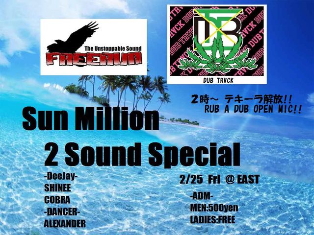 ☆★☆Sun Million☆★☆ -REGGAE HIP HOP R&B- 何が起こるかわからない!! 特別企画!! FREE RUN & DUB TR∀CK 2 Sound Special Night 2月25日 ( friday ) 京都 木屋町 @CLUB EAST(元GHOST) -OPEN- 22:00-TILL MORNING -ADM- MEN:500YEN LADIES:FREE 外人さんFREE -SOUND- 【FREE RUN from 大阪】 【DUB TR∀CK】 -DEEJAY- 【COBRA】 【SHINEE】 -DANCER- 【ALEXANER from 大阪】 -HOST MC- 【CHAN】 and more! ■RUB A DUB OPEN MIC■ □TEQUILA FREE 02:0