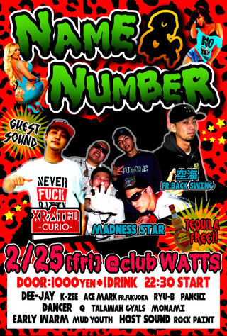 ■■NAME&NUMBER■■ 2/25[fri] @club WATTS 22:30 open&start Door:\1000[要1D] ■GUEST SOUND■ CURIO XRATED fr.福岡 MADNESS STAR fr.熊本 空海 fr.Back Swing ■DEE-JAY■ K-ZEE ACE MARK fr.福岡 RYU-B PANCHI ■SOUND■ ROCK PAINT MUD YOUTH ■DANCE SHOW■ Q TALAWAH GYALS MONAMI ■FLOOR■ DONNA CHARM MAYUMI AYAKA and you!!!