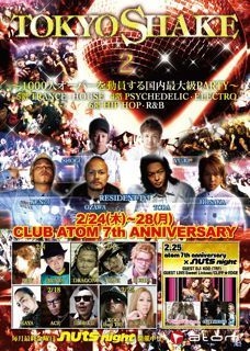 今週金曜は、Club atom毎週金曜日恒例の『TOKYO SHAKE』 今回はATOM 7周年アニバーサリーTOKYO SHAKE×nuts nightスペシャルCLIFF EDGE DJ KOO(TRF)、須田朱音(nuts)、REW(PSCHEDELICLOVER)、YAGI(N.P.D SHOUD CREW)、ACE(Rebel)出演 金曜No,1 PARTY 1000人規模 毎月多彩なGUESTアーティスト、ファッション誌とタイアップを行い、女性のお客様を中心に盛り上がっている金曜日! イベント企画の華やかさはClub atom NO.1! 2/25ディスカウントのご案内です 通常3000円
