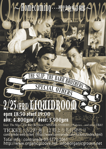 Organic Groove ~Homecoming…聖地帰郷~ Live: The Slip The Barr Brothers SPECIAL OTHERS(acoustic set) Nabowa ...and more TBA!! 2/25 (FRI)@LIQUIDROOM 18:30 open / 19:00 start http://www.organicgroove.net/