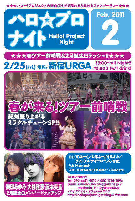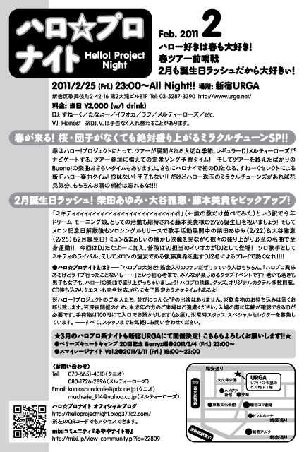 東京ハロ☆プロナイト 〜ハロー好きは春も大好き! 春ツアー前哨戦 2月も誕生日ラッシュだから大好きぃ!〜 日時: 2011年02月25日 (金) 23:00〜All Night! 会場: 新宿URGA 住所: 新宿区歌舞伎町2-42-16第二大滝ビルB1 Tel: 03-5287-3390 http://www.urga.net/ 料金: 当日2,000円 (1ドリンク付) DJ: すねーく/たなよー/イワオカ/メルティーローズ/etc. VJ: Honest ※予告なくDJ&VJは入れ替わることがあります。 ■春が来る! 桜・団子がなくても絶対盛り上がるミラクルチューンSP!! 春はハロー!プロジェクトにと