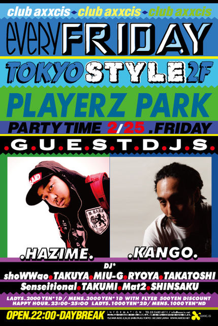 管理人様告知失礼します。 今夜、いま渋谷で最も注目されてるclub axxcisで超豪華なPARTY開催します! その名は"PLAYERZ PARK"! 毎週金曜に開催されているこのパーティー、週替わりで日本を代表するHipHopDJがプレイ。群がるPartyPeopleは1000人超! 言わずもがな、毎回フロアはテンションMAXに! 今回の2/25(金)はなんと、ゲストに日本が世界に誇る『DJ HAZIME』、そして『DJ KANGO』を迎えます!日本クラブシーンの2トップと言っても過言ではない鉄壁の布陣! 2/25、1番クールで1番盛り上がるクラブパーティーは"PLAYERZ
