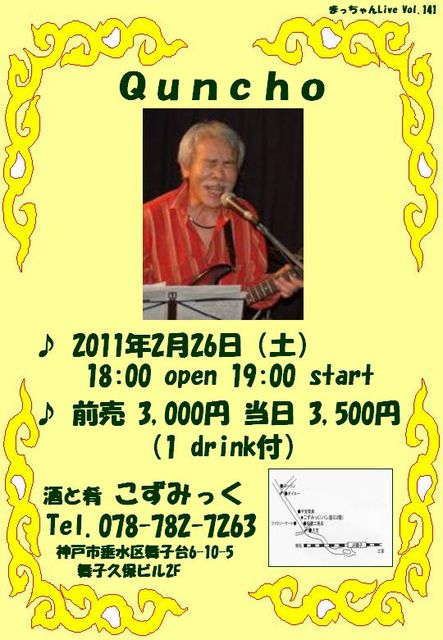 ☆ Quncho ☆ 日時:2011年2月26日(土) 18:00 open 19:00 start 料金:前売 \ 3,000 当日 \ 3,500 (1 drink付) 会場:酒と肴 こずみっく Tel.078-782-7263 神戸市垂水区舞子台6-10-5 舞子久保ビル2F