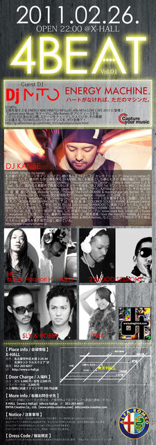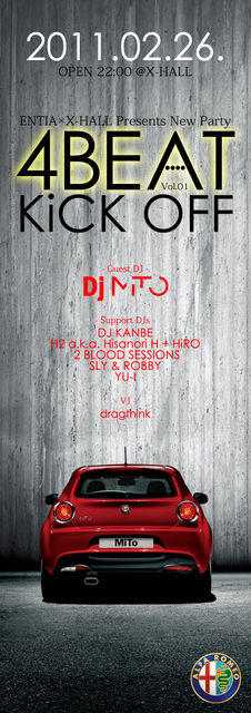 ENTIA × X-HALLがお届けするNEW PARTY 『4BEAT』 今回は世界的に有名な自動車メーカー"Alfa Romeo"とのフューチャリングにて開催が決定! Guest DJには“Capture your Music”をテーマに、Alfa Romeoによりプロデュースされた 五感を揺さぶるENERGY MACHINE『DJ MiTO』が登場。 その正体は会場にお越し頂いた方のみだけ知ることができます! Support DJsには"DJ KANBE"をはじめ "H2 a.k.a. Hisanori H+HiRO" "2 BLOOD SESSIONS" "SLY & ROBBY" "YU-I"が 2月26日(土)のX-HALLをヒートアップさせます。 NEW PARTY『4BEAT』との起源とな