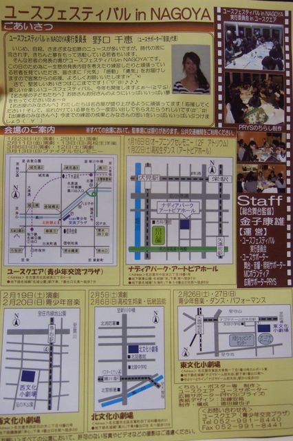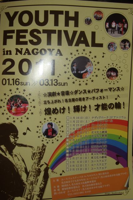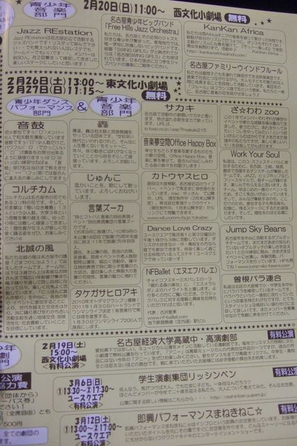 来春、名古屋市が関わる大きなイベントに 言葉ズーカ、じゅんこちゃんが参加します。 1/16(sun)−3/13(sun)名古屋市内各所で開催されるステージ(詳しくはコメント覧を参照) 我々、言葉ズーカは2/26(sat) そして、じゅんこちゃんは2/27(sun) 共にナゴヤドーム横の「東文化小劇場」で 何と入場無料です。 演劇★音楽☆ダンス★パフォーマンス☆ 立ち上がれ!名古屋の若きアーティスト! 煌めけ!輝け!才能の輪! 【題】『YOUTH FESTIVALinNAGOYA2011』 《青少年ダンス パフォーマンス&青少年音楽部門》 【日時】2/26(土)12:30開